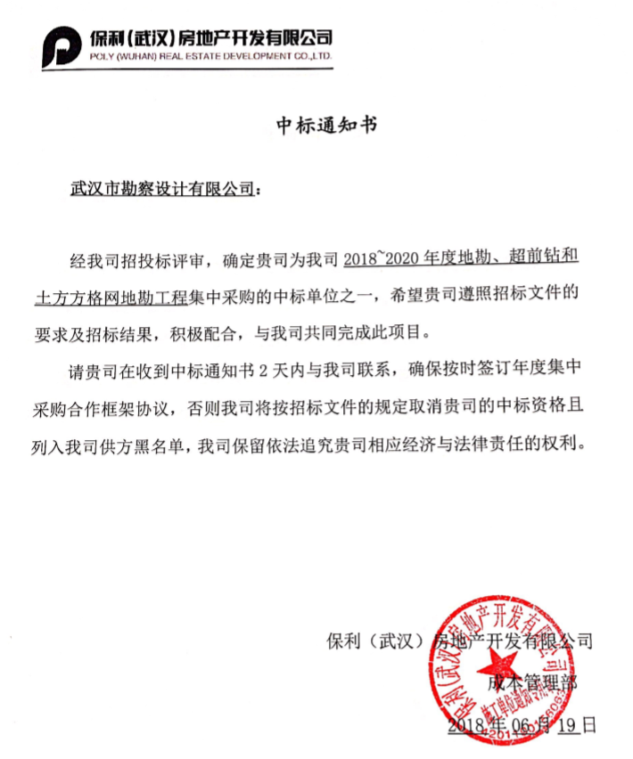 公司中標(biāo)保利(武漢)房地產(chǎn)開發(fā)有限公司2018-2020年度勘察項目
